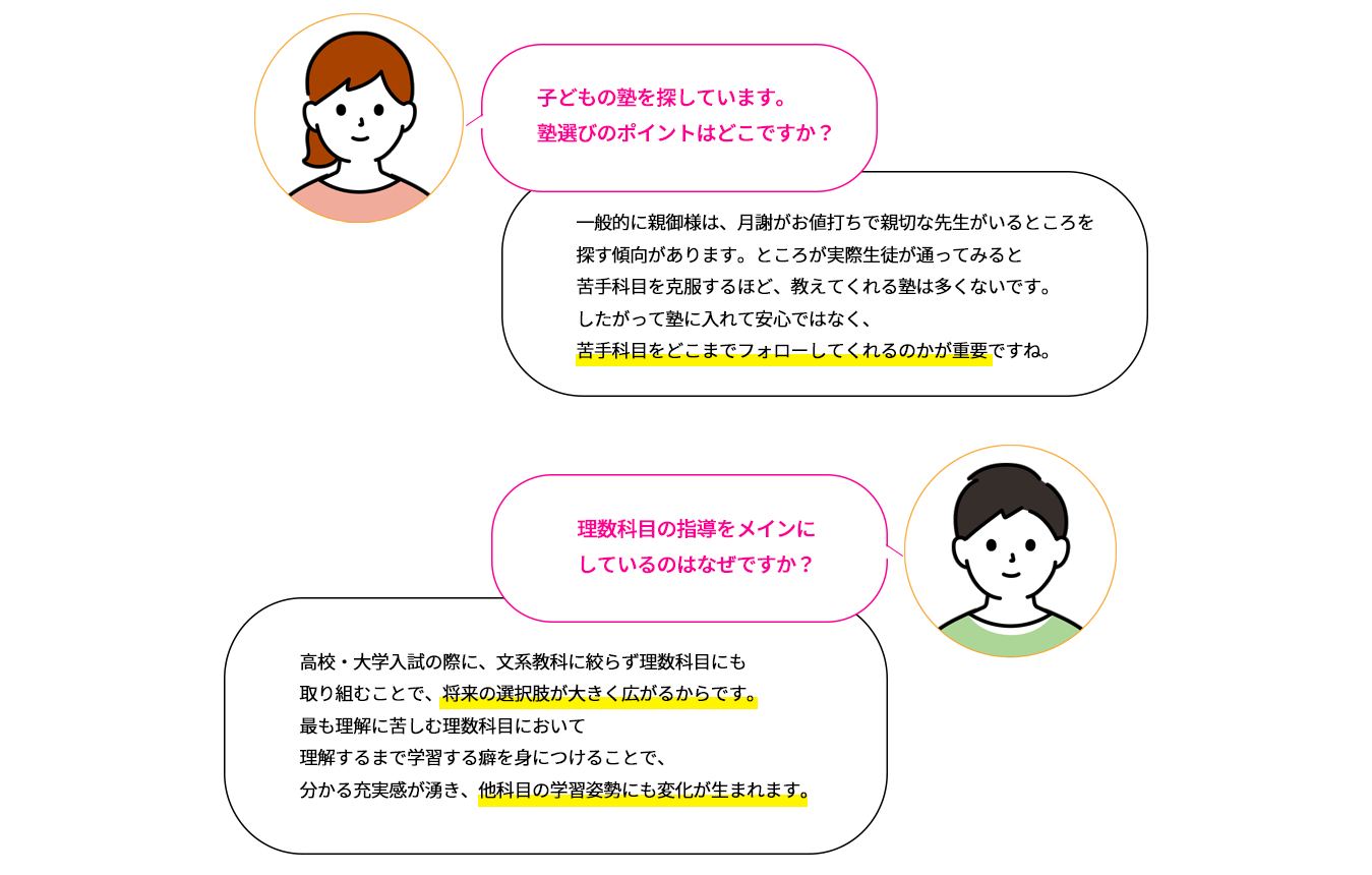 A 学生時代から熱心に勉強に取り組み、苦難を乗り越えてきた 経験があるからこそ生徒の気持ちが誰よりも理解でき、 心の通った指導ができるからです。